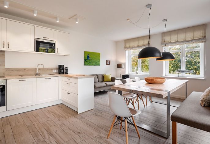 Das Objekt Villa de Meere - mit 8 individuellen und exklusiven Wohnungen - befindet sich in einer ruhigen Seitenstraße nahe dem Nieblumer Ortskern. Die Wohnung Villa de Meere 5 zeichnet sich durch eine große Dachterrasse mit gemütlichen Loungemöbeln aus. Die Terrasse wird sicherlich Ihr Lieblingsplatz. Hier fängt der Tag mit einem ausgiebigen Frühstück an, und am Abend genießen Sie Ihr Glas Wein mit Blick auf die Grünanlage und den Dorfteich De Meere. Die Küche mit dem wunderbar großen Essplatz ist das Herzstück der Wohnung. Hier können Sie kochen, klönen und den Urlaubstag planen. Wenn es Zeit zur Entspannung ist, bieten Ihnen die gut geschnittenen Schlafräume viel Platz. Nieblum selbst, das wohl schönste Inseldorf, ist geprägt von reetgedeckten alten Kapitänshäusern, wunderschönen Bauerngärten und dem Friesendom St. Johannis. Der Nieblumer Strand liegt nicht weit vom Ortskern entfernt. Cafés, Restaurants sowie ein Bäcker und Einkaufsmöglichkeiten für den täglichen Bedarf sind im Ort vorhanden und bequem zu Fuß zu erreichen.