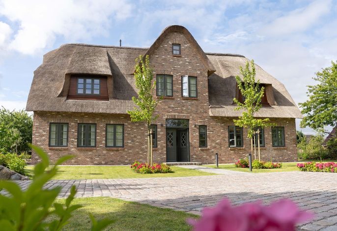 Der großzügige Garten ist mit einem bepflanzten Friesenwall umzogen. Zwei PKW-Stellplätze, eine Ladestation für E-Autos sowie ein abschließbarer Abstellraum für Ihre Fahrräder in der reetgedeckten Garage runden das Angebot ab.
