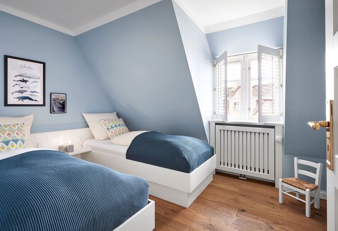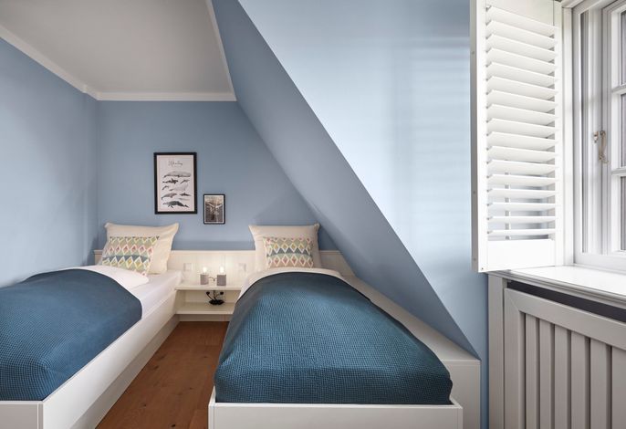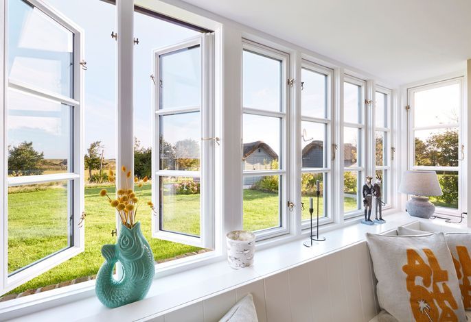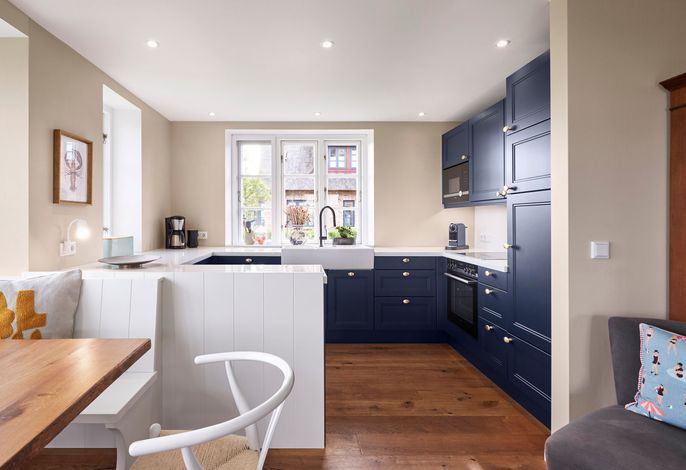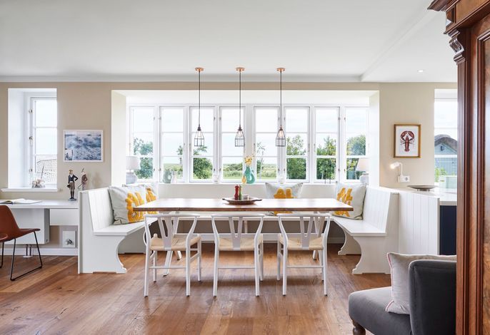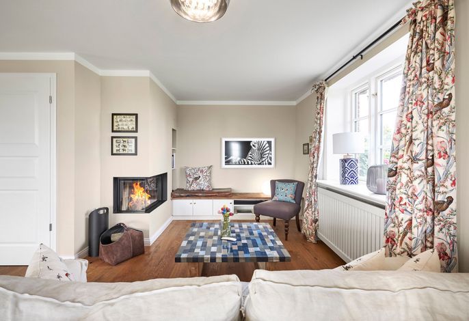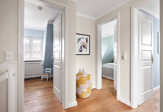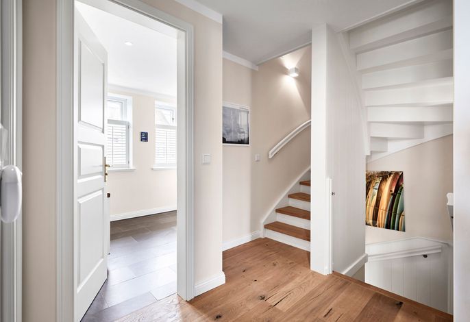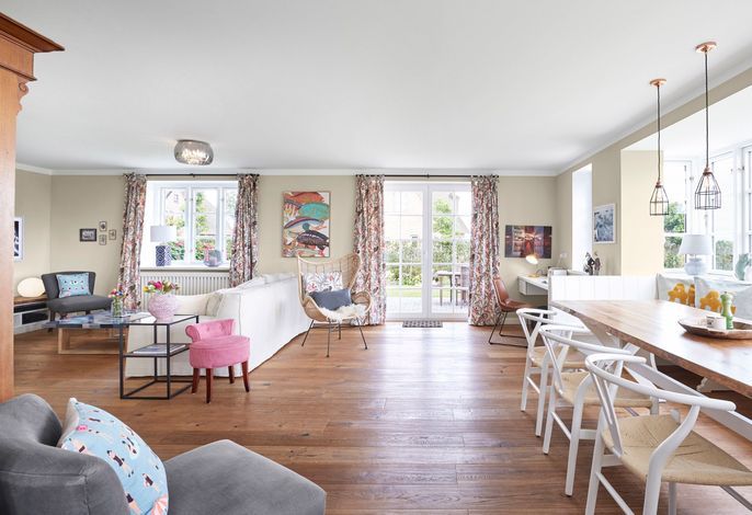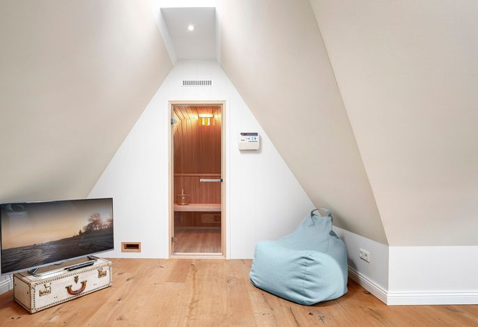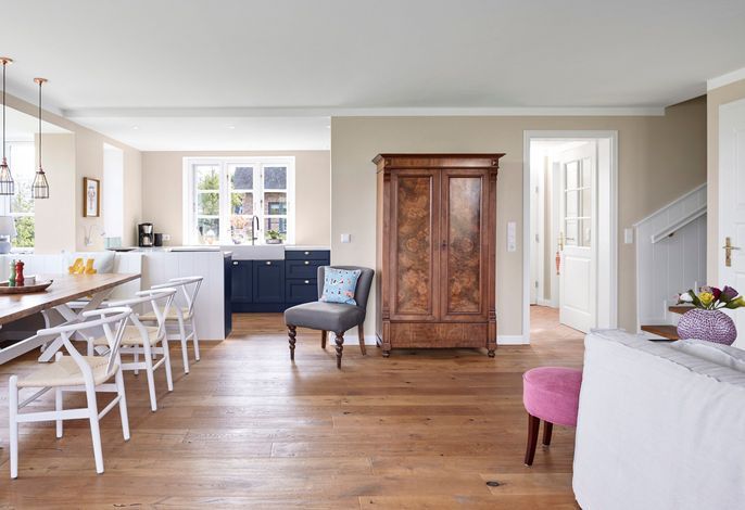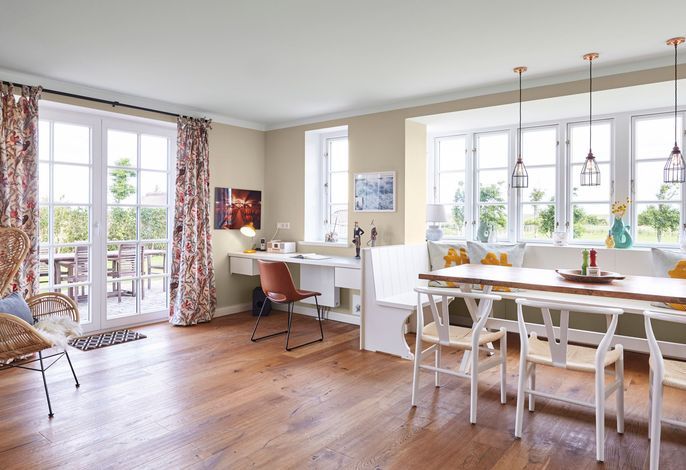 Das Haus bietet Platz für 6 Personen in drei Schlafzimmern. Der Kamin im Wohnzimmer lässt es zu jeder (Jahres-)Zeit gemütlich werden. Die Utlucht mit großem Esstisch und die offene Küche sind perfekt für die große Runde mit Familie und Freunden. Im Dachgeschoss können Sie den Tag in Ruhe bei einem erholsamen Saunagang ausklingen lassen und ungestört relaxen.