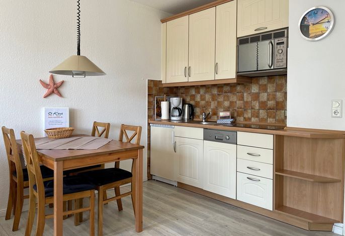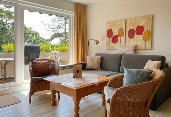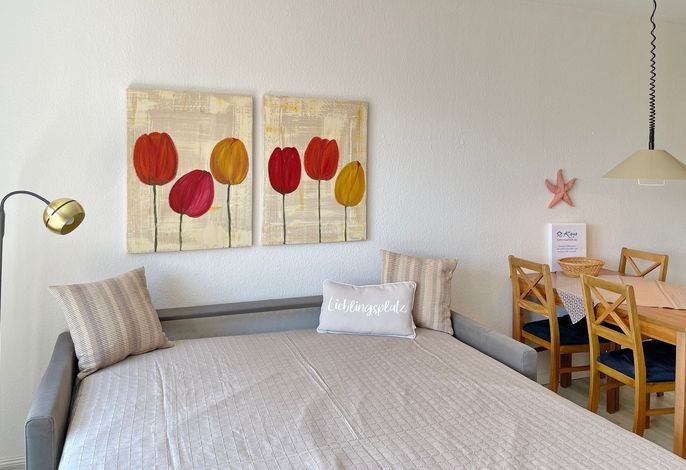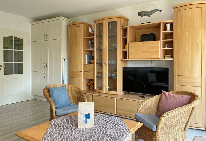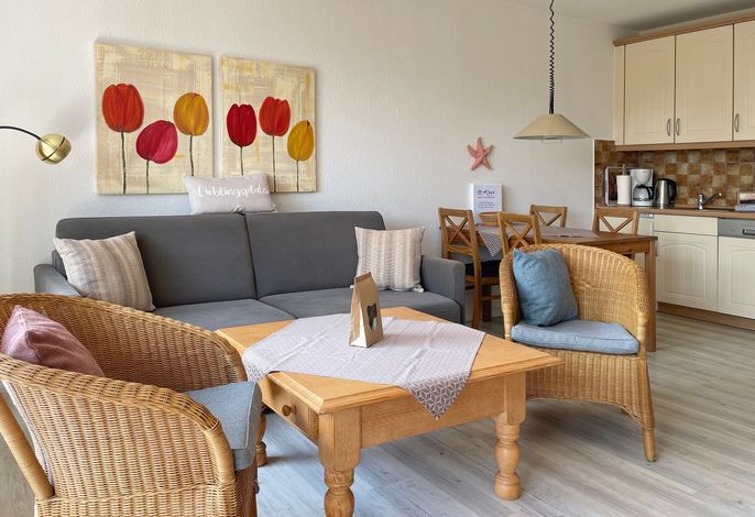 Unsere einladende Wohnung Watt'n Blick befindet sich nahe des Wyker Leuchtturms nur einen Katzensprung vom Strand entfernt und eignet sich für 2 Personen hervorragend für einen erholsamen Urlaub. Das Wohnzimmer mit hochwertiger Schlafcouch (170x190cm), integrierter Essecke und gut ausgestatteter Küchenzeile ist mit WLAN, Internet- TV und einer Stereoanlage sowie einer kleinen Auswahl an Büchern ausgestattet. Von hier aus gelangen Sie auf den Balkon mit einer automatisch ausfahrbaren Markise. Das kleine Duschbad mit Handtuchheizung ist funktional eingerichtet und im separaten Schlafzimmer mit Doppelbett (140 x 200 cm) können Sie ruhige Nächte erleben. Waschmaschine und Trockner stehen zur gemeinschaftlichen Nutzung gegen eine geringe Gebühr bereit und zur Wohnung gehört ein eigener PKW-Stellplatz.