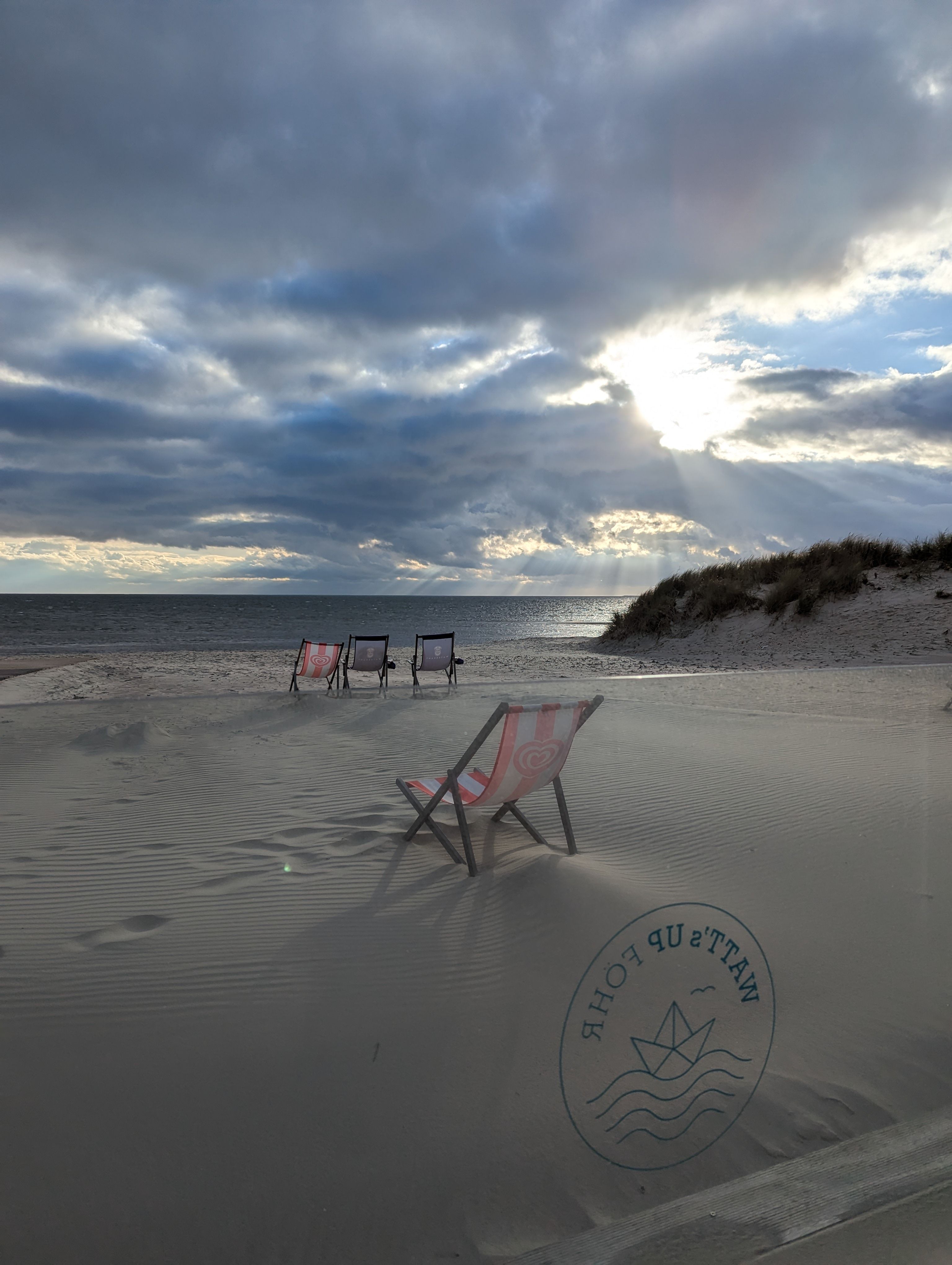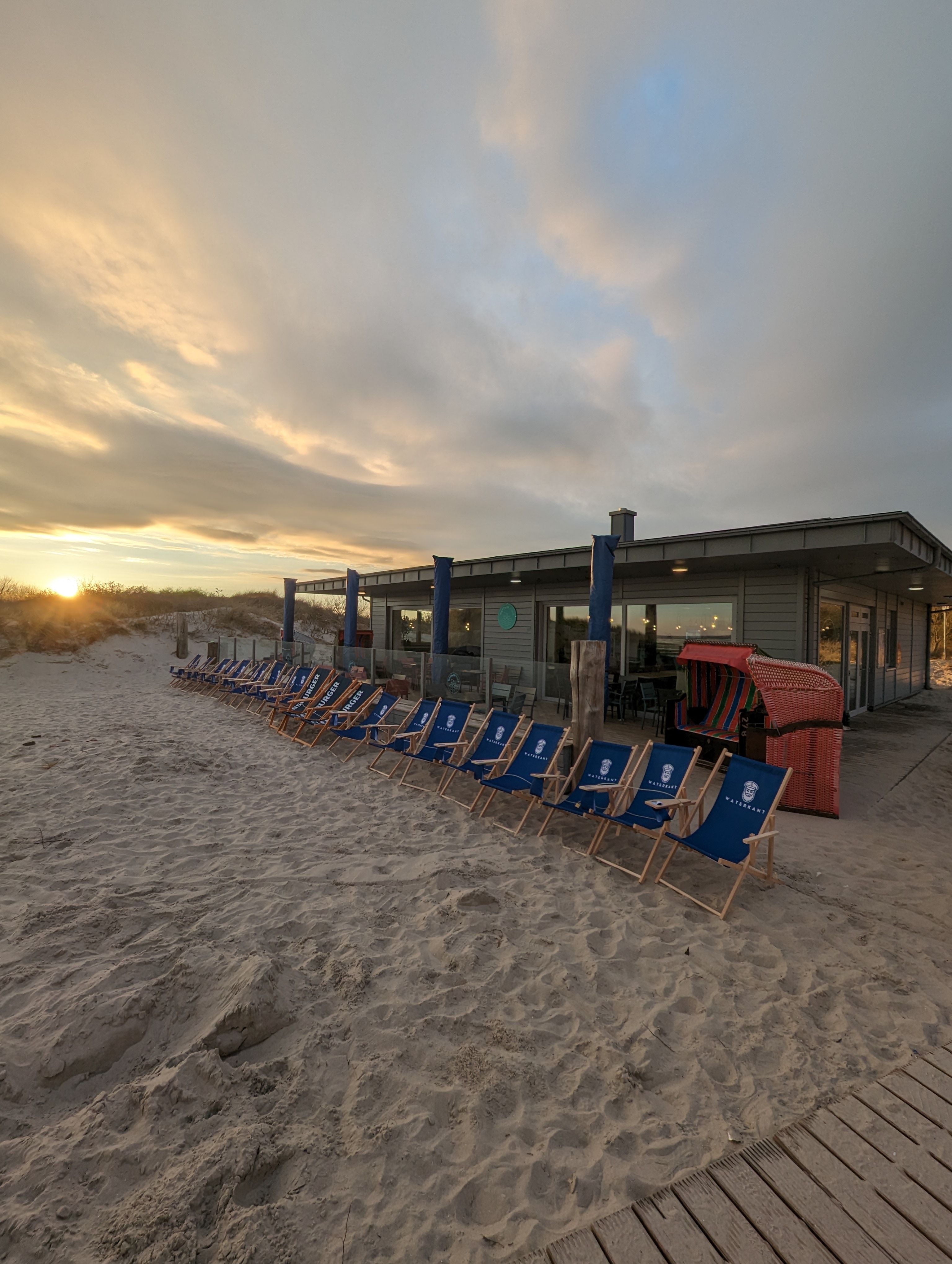 Kleine Strandbar zwischen Dünen mit einem wundervollen Ausblick auf die schöne Nordsee. Leckeres Essen und Getränke – bei schlechtem Wetter drinnen, sonst auf der großen Terrasse oder direkt am Strand. Hier gibt es neben guter Laune und Urlaubsfeeling auch regionale, fair gehandelte und Bio-Produkte. Für Veganer ist ebenfalls etwas dabei. Mit etwas Glück gibt es abends auch mal Livemusik.