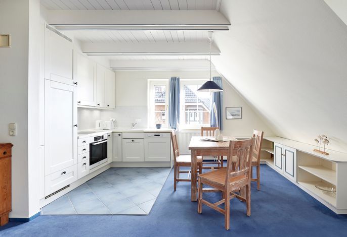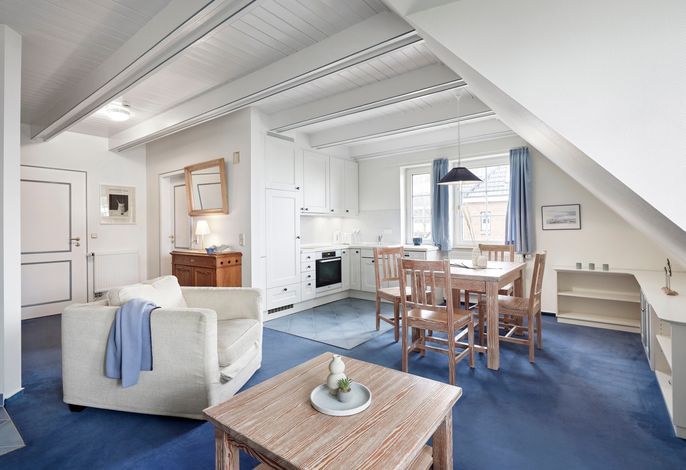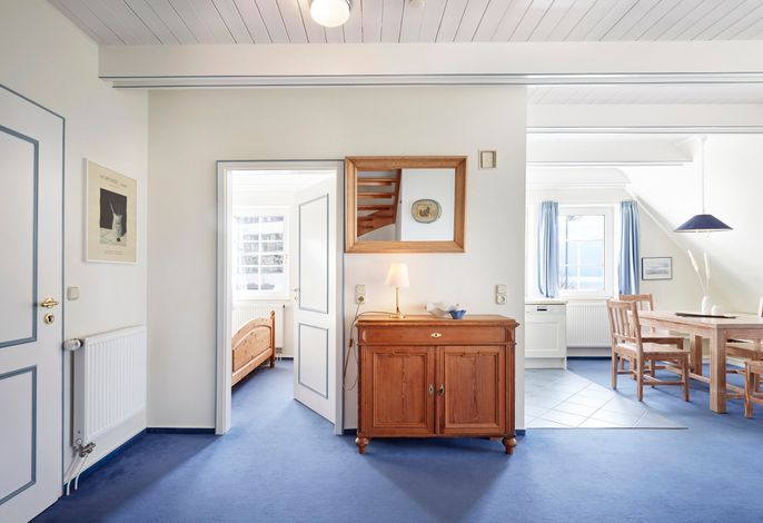 Herzlich Willkommen am Südstrand in Wyk auf Föhr! Eine gemütliche kleine Ferienwohnung direkt am feinsandigen Südstrand mit Blick auf die Halligen erwartet Sie. Die Wohnung befindet sich im Obergeschoss eines 1985 errichteten reetgedeckten Friesenhauses. Die Lage am Ende einer ruhigen Spielstraße, unmittelbar am Strand und am alten Nordsee-Kurpark ist ideal für Erholungsuchende, Wassersportler, Genießer und Meerverliebte. Über die Promenade erreichen Sie zu Fuß das Zentrum Wyks in 25 Minuten. Die Wohnung ist nordisch-gemütlich mit gelaugten Kiefernmöbeln und naturweißem Sofa und Sesseln eingerichtet. Sie bietet zwei Personen großzügig Platz, um sich wohlzufühlen. Zur Wohnung gehören ein Schlafzimmer, ein Bad mit Dusche und WC sowie ein großzügiger Wohn-Essbereich. Zur Ausstattung gehören unter anderem ein moderner 43‘‘ OLED Smart-TV (Airplay fähig). Ein Strandkorb steht Ihnen im Strandabschnitt vor dem Haus zur Verfügung. Die Nutzung des Gartens ist den Mietern der Erdgeschosswohnung vorbehalten. Ihr Auto können Sie auf dem zur Wohnung zugehörigen Parkplatz abstellen.