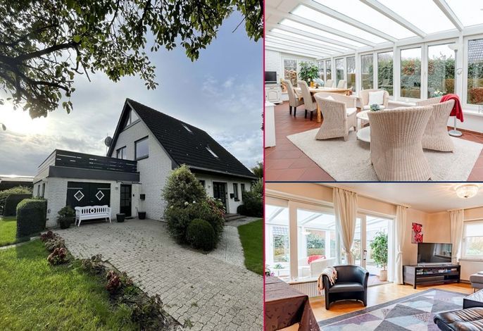 Die Ferienwohnung ist im Erdgeschoss gelegen und verfügt über einen großzügigen Wohn- und Essbereich mit separater Küche, zwei Schlafzimmer, einen Wintergarten, ein Duschbad und ein Gäste-WC, sowie einen gemeinschaftlich genutzter Hauswirtschaftsraum mit Wachmaschine und Trockner. Die Schlafzimmer sind mit einem Doppelbett bzw. zwei Einzelbetten ausgestattet. Über das Doppelbettzimmer und den Wohnbereich gelangen Sie in den Wintergarten und von dort aus direkt auf die eigene Terrasse und in den Garten.