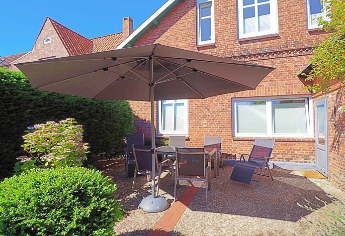 Im Garten des Hauses haben Sie Ihre eigene Terrasse mit Terrassenmöbeln und Sonnenschirm.