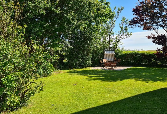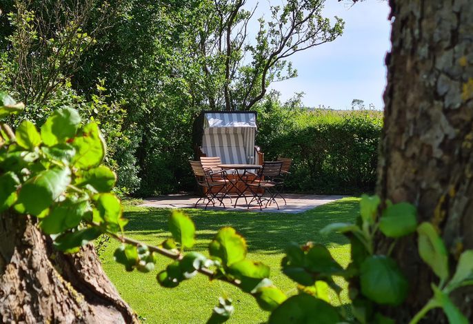 Außerdem gehört zu der Ferienwohnung im großzügigen Garten eine eigene Terrasse mit Gartenmöbeln und einem schönen Strandkorb.