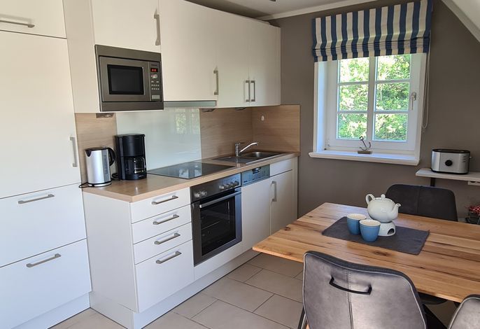 Zudem erreichen Sie den modernen Wohn-/Essbereich mit integrierter heller Küchenzeile. Es stehen Ihnen neben dem Herd auch ein Kühlschrank mit kleinem Gefrierfach, einer Mikrowelle, Kaffeemaschine, Toaster, Wasserkocher und sämtliches Geschirr und Küchenutensilien zur Verfügung.