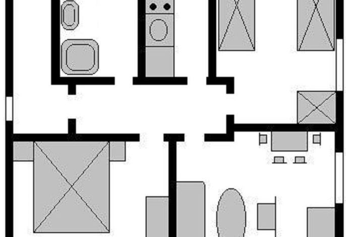 Sie haben 2 Schlafräume mit je 2 großen Betten, ein Wohnzimmer, eine Küche und ein Badezimmer. Auf Wunsch ersetzen wir ein Bett durch ein Kinderbett.