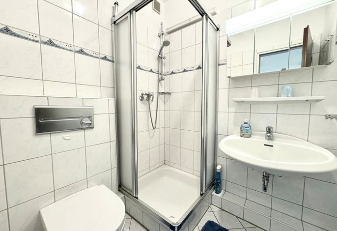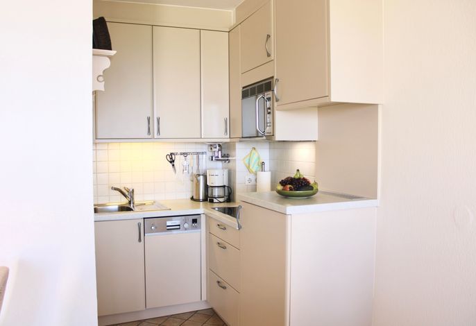 Das Duschbad und die kleine moderne Küchenzeile mit Essplatz sind zweckmäßig und komfortabel ausgestattet. Ein separates Schlafzimmer mit Doppelbett gehört ebenfalls zur Wohnung.